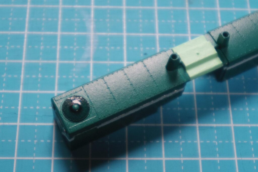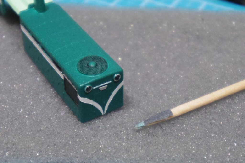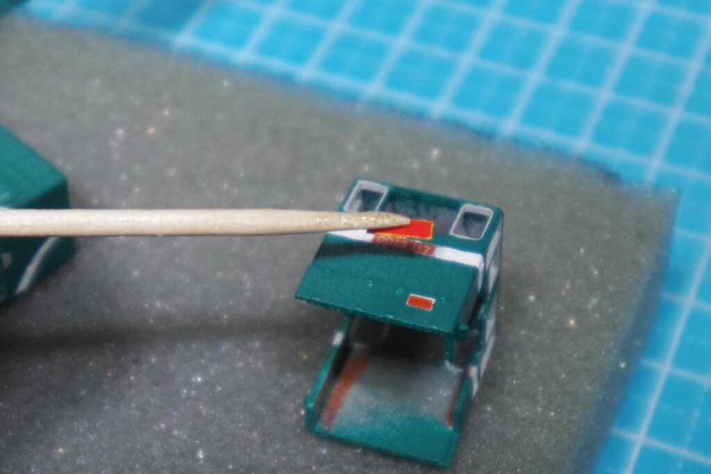 完全に乾いたら、使った塗料と同じ種類(水性アクリル・エナメル)の溶剤を綿棒に含ませ、余分なスミ入れ塗料を拭き取ってください。