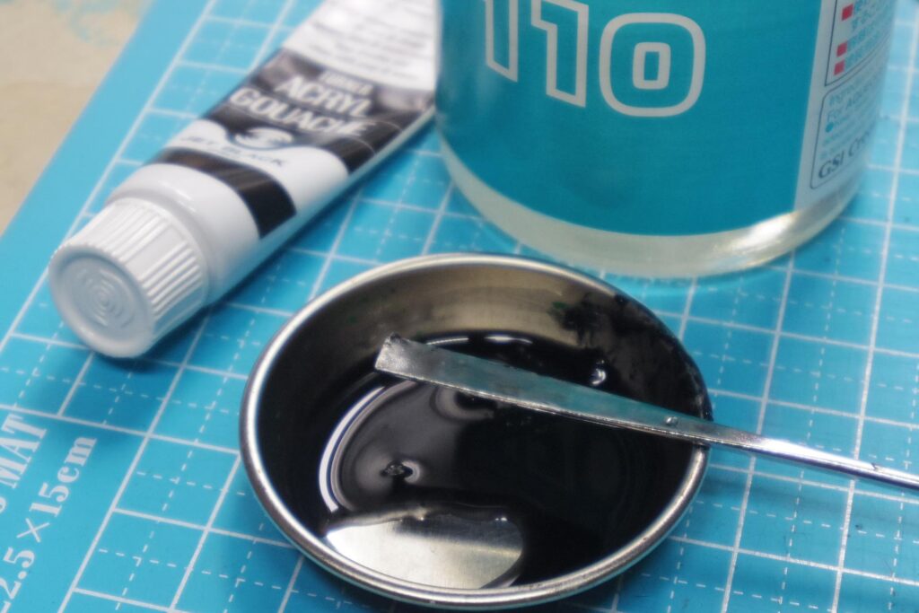 アクリルガッシュ「ジェットブラック」を水性ホビーカラーうすめ液でかなり薄めに希釈しました。